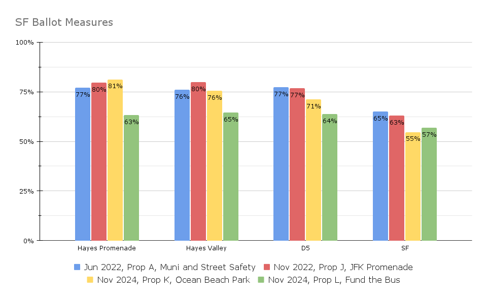 Most notably, Hayes Promenade voters approved Prop K in Nov 2024, to permanently pedestrianize the Great Highway into Ocean Beach Park, by a whopping 81%!
