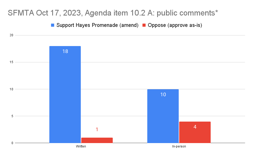 On October 17 and November 7, 2023, the SFMTA heard public comment for agenda items relating to Hayes Promenade. Below is an analysis of the public comments, both written and in-person, submitted for these agenda items.