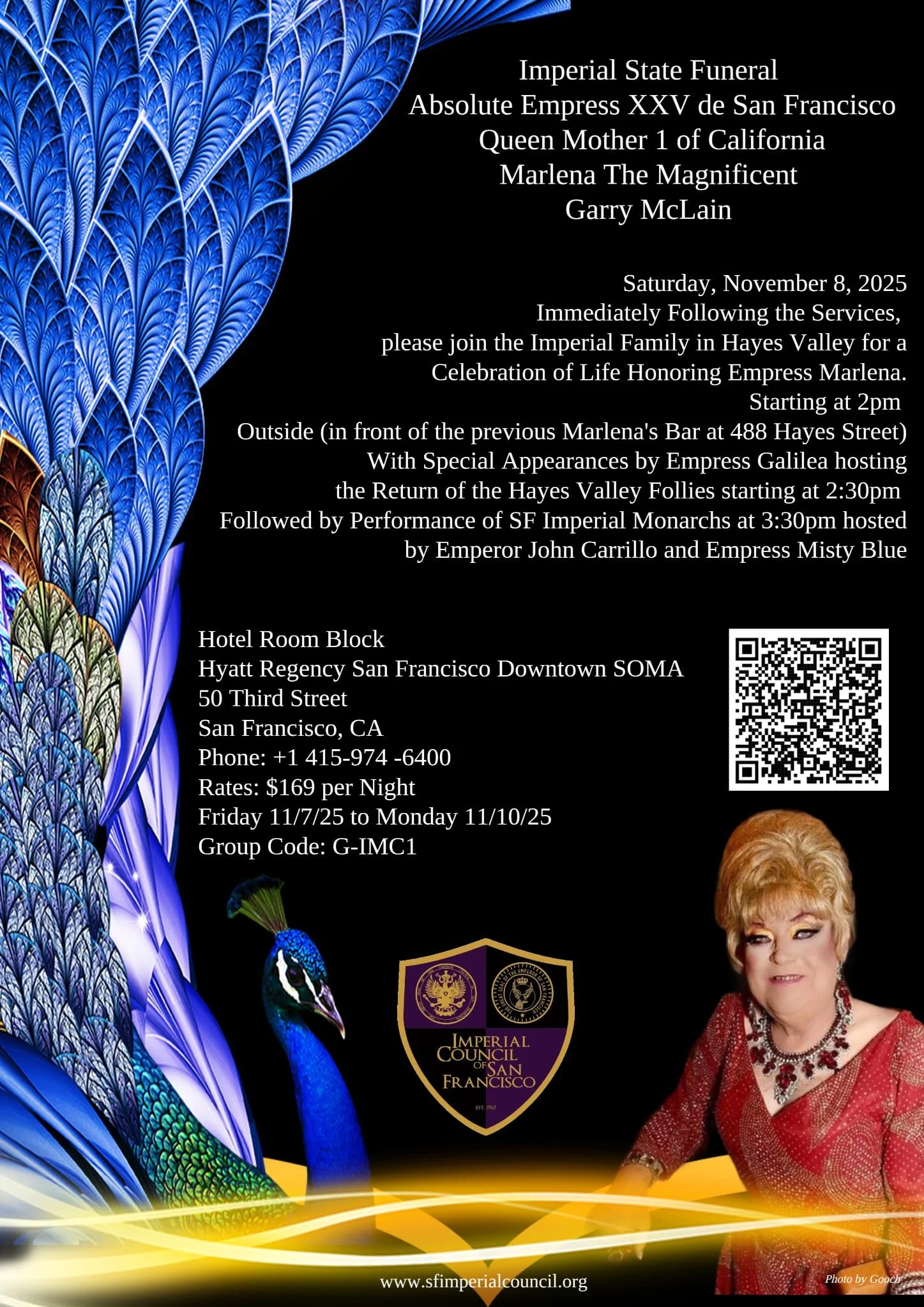 Celebration of Life Honoring Empress Marlena Saturday, November 8, 2025 2:00 PM 8:00 PM Marlena's 488a Hayes Street San Francisco, CA, 94102 United States (map) Google Calendar ICS